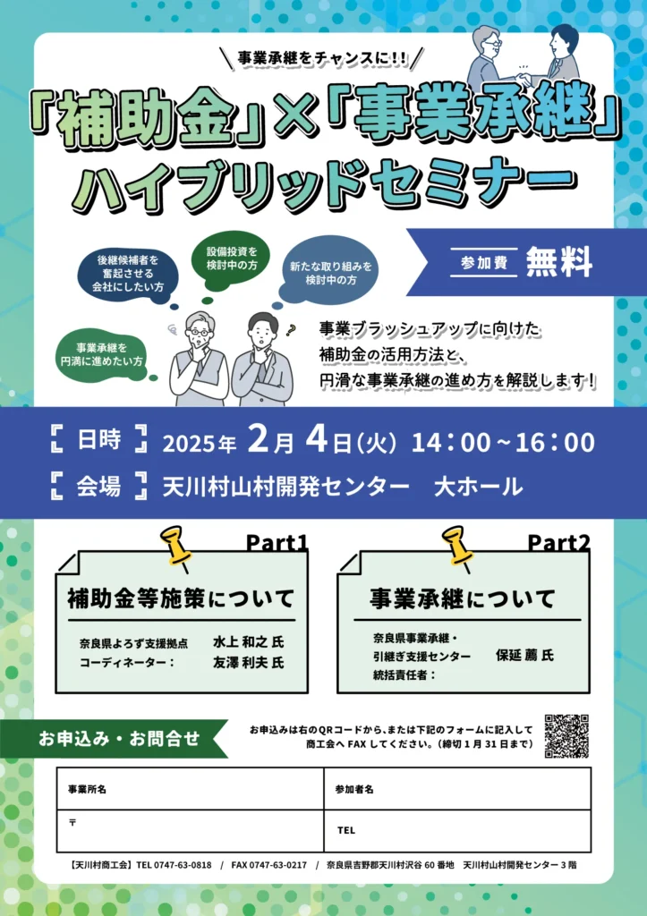 事業承継セミナー 印刷物 works やらせてもらったこと 事業承継セミナー 天川村商工会が企画した補助金と事業承継のハイブリッドセミナー。セミナーのチラシを制作させていただきました。 「難しそう…」と思う方でも気軽に参加できるよう、分かりやすさを最優先にデザイン・文章を構成。リラックスして、相談しやすい雰囲気のチラシに仕上げました。 主にしたこと 内容整理・チラシ制作 contact お問い合わせ ホームページやオンラインショップを始めたい・リニューアルしたい方、各種デザイン・写真動画制作のご依頼やご相談はこちらからお気軽にお問い合わせください。 問い合わせる